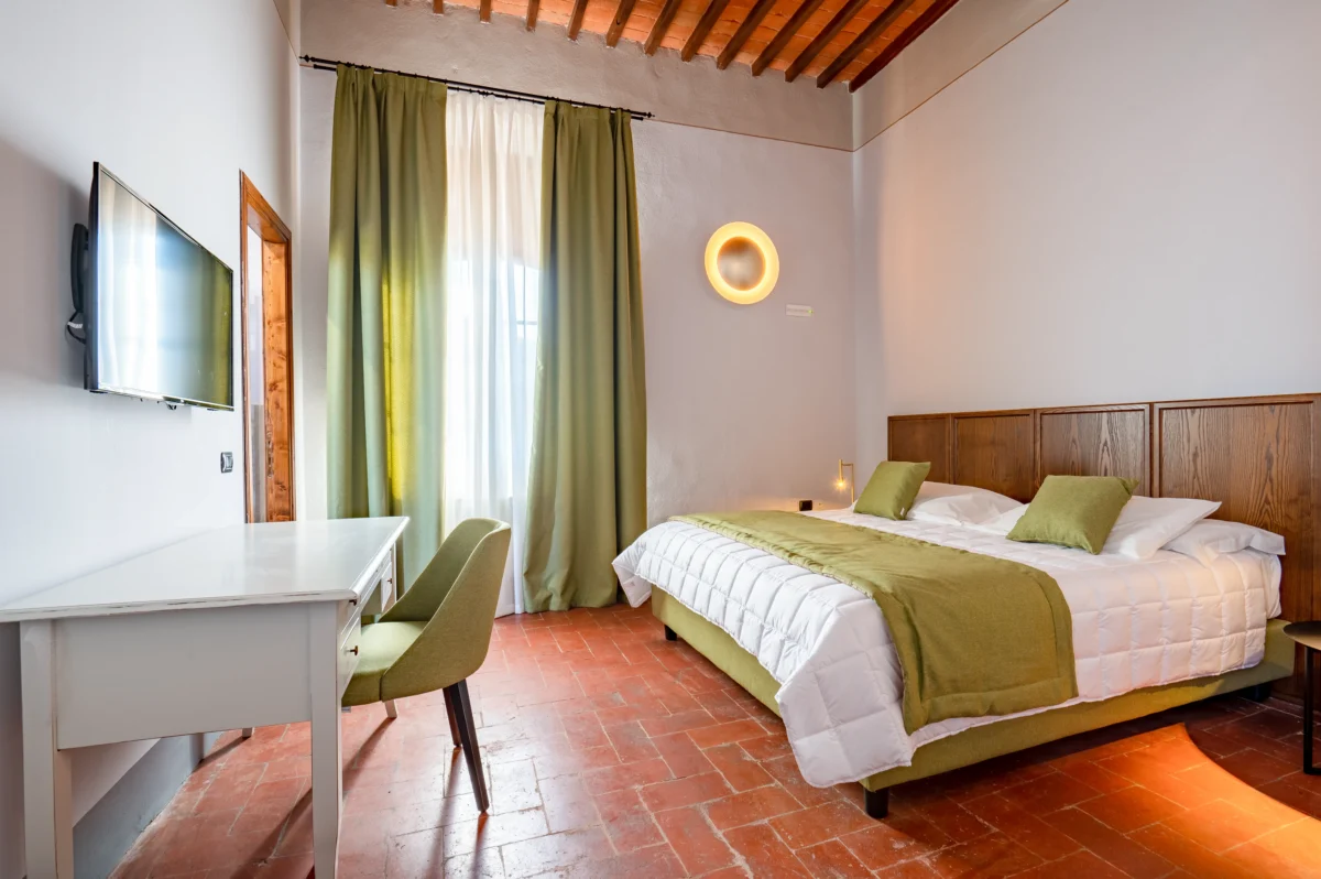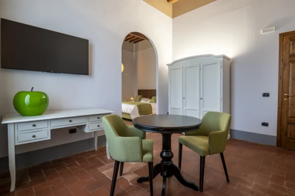 Le due Suite, contraddistinte da un design moderno, raffinato ed elegante, sono situate all’interno della Villa. Da poco ristrutturate, sono composte da una grande camera da letto matrimoniale e una confortevole area soggiorno con un comodo divano e scrivania o console.